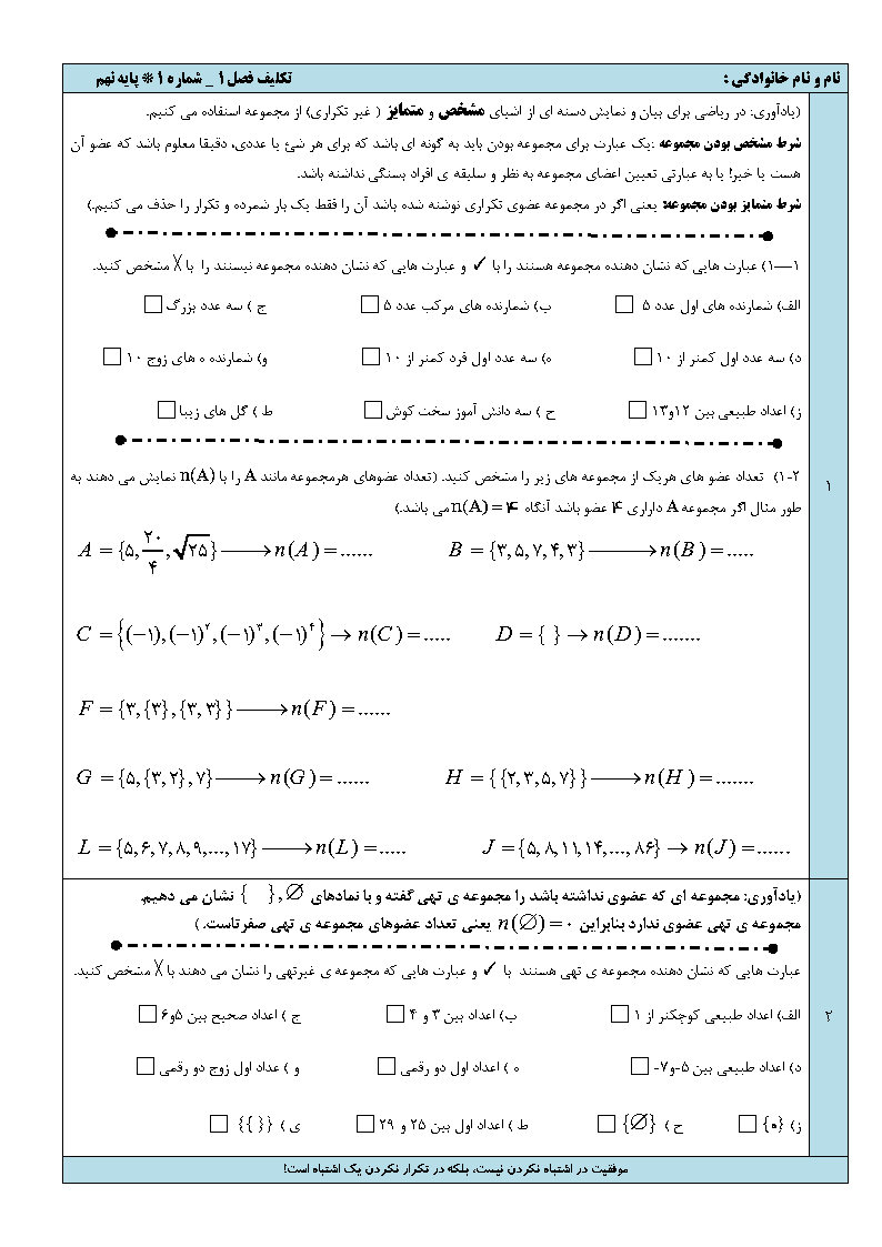 فایل word و Pdf تکلیف درس اول فصل اول ریاضی نهم: