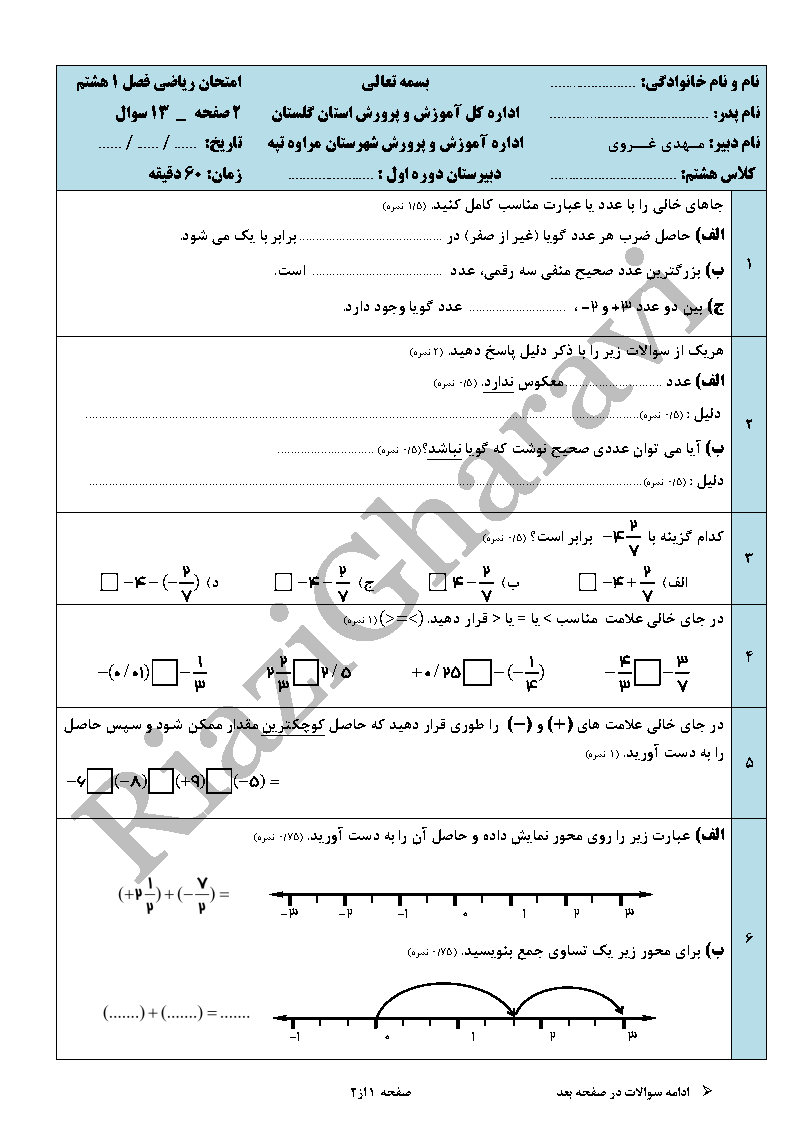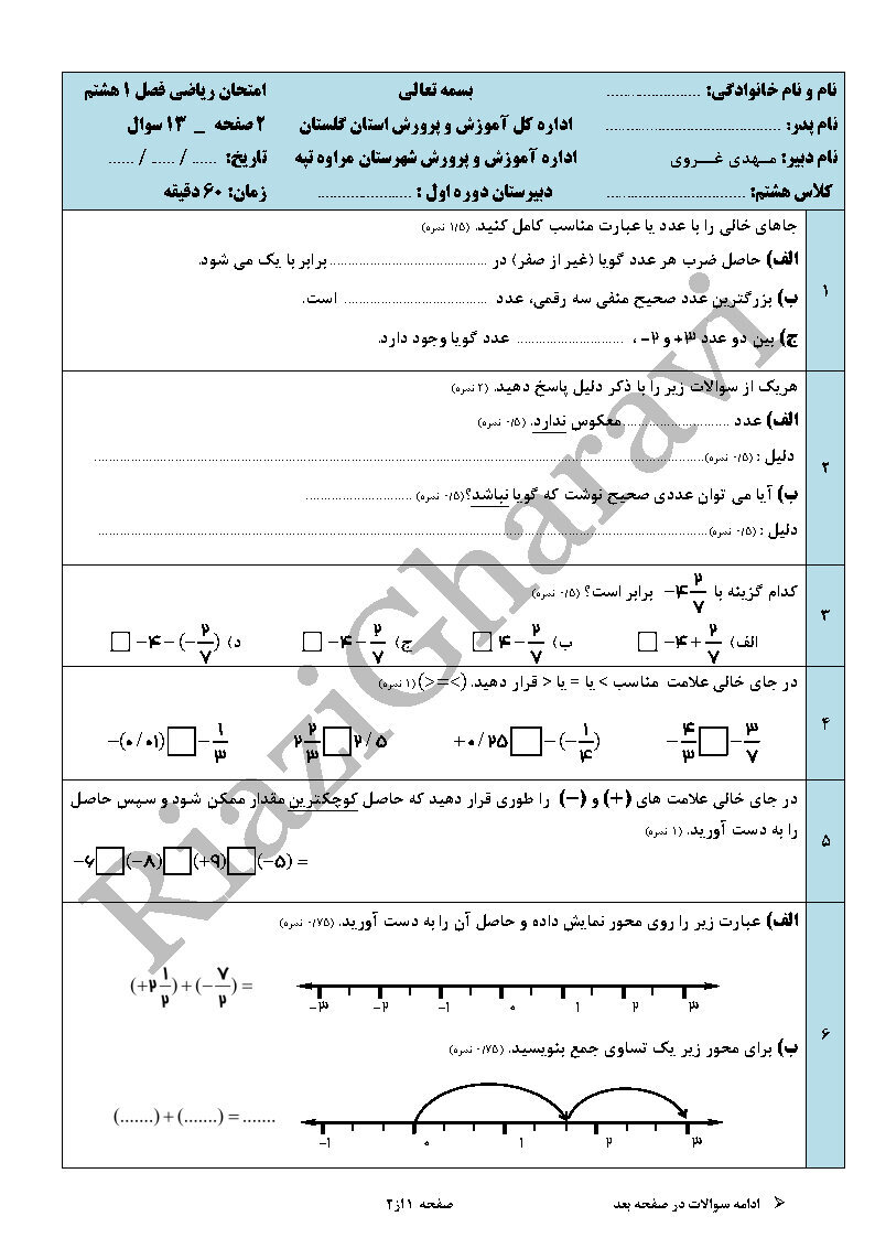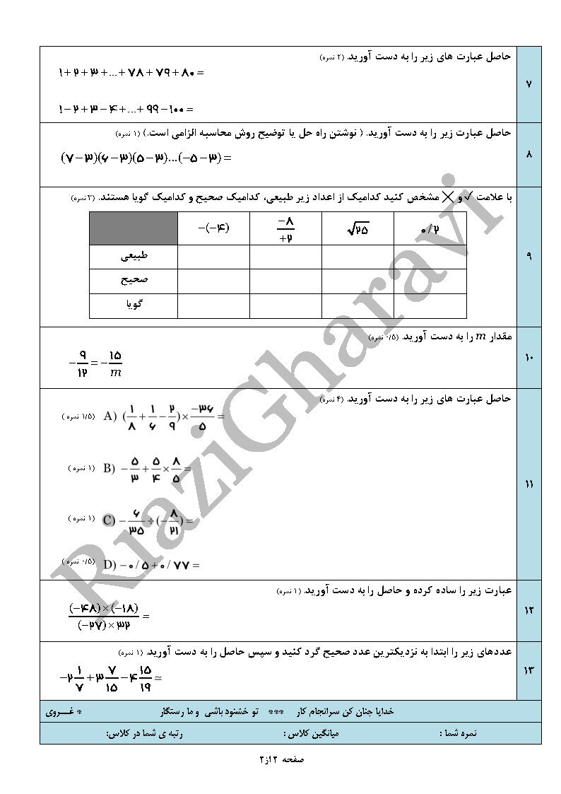 فایل wordو pdf (بدون واترمارک) نمونه سوال امتحان ۲۰ نمره ای فصل اول ریاضی هشتم.