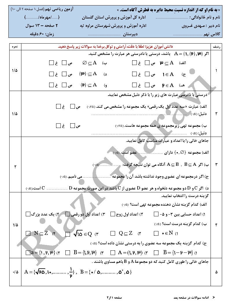 درس ۱ و ۲ (صفحه ۲ ال ۱۰) فصل اول ریاضی نهم